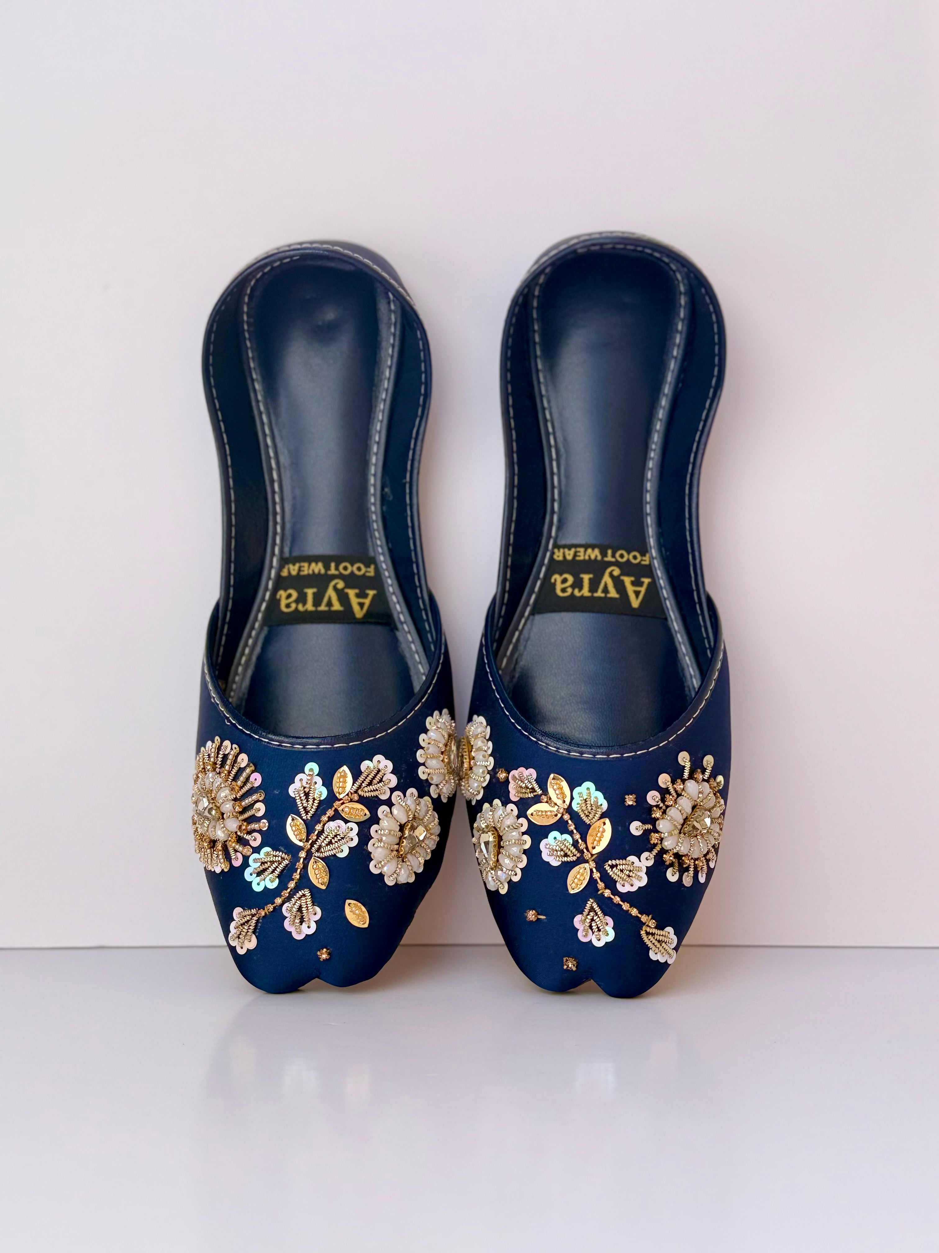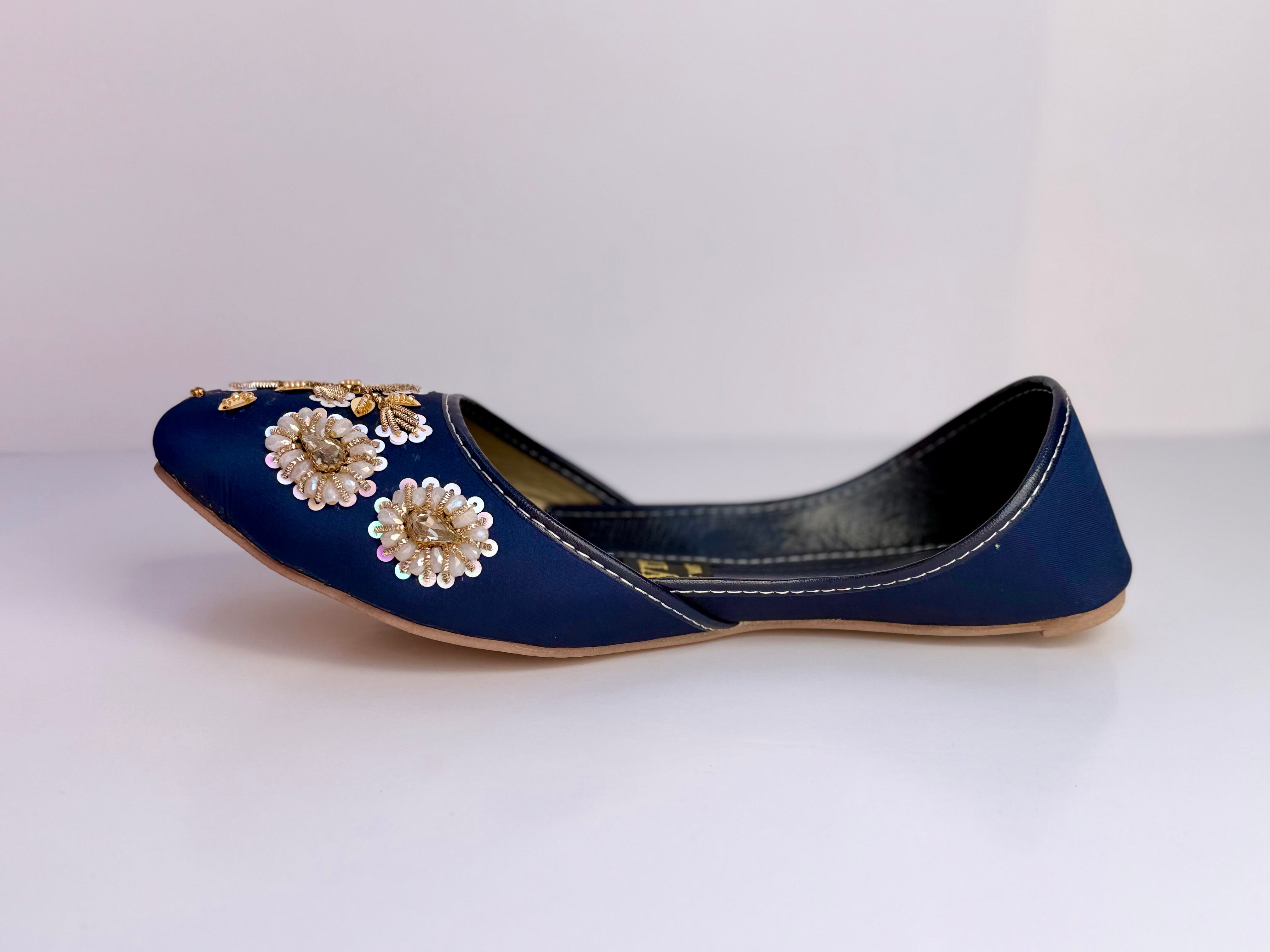 GULZAAR β Deep Persian Blue Khussa with Gold-White Floral Embroidery and Regal Beadwork