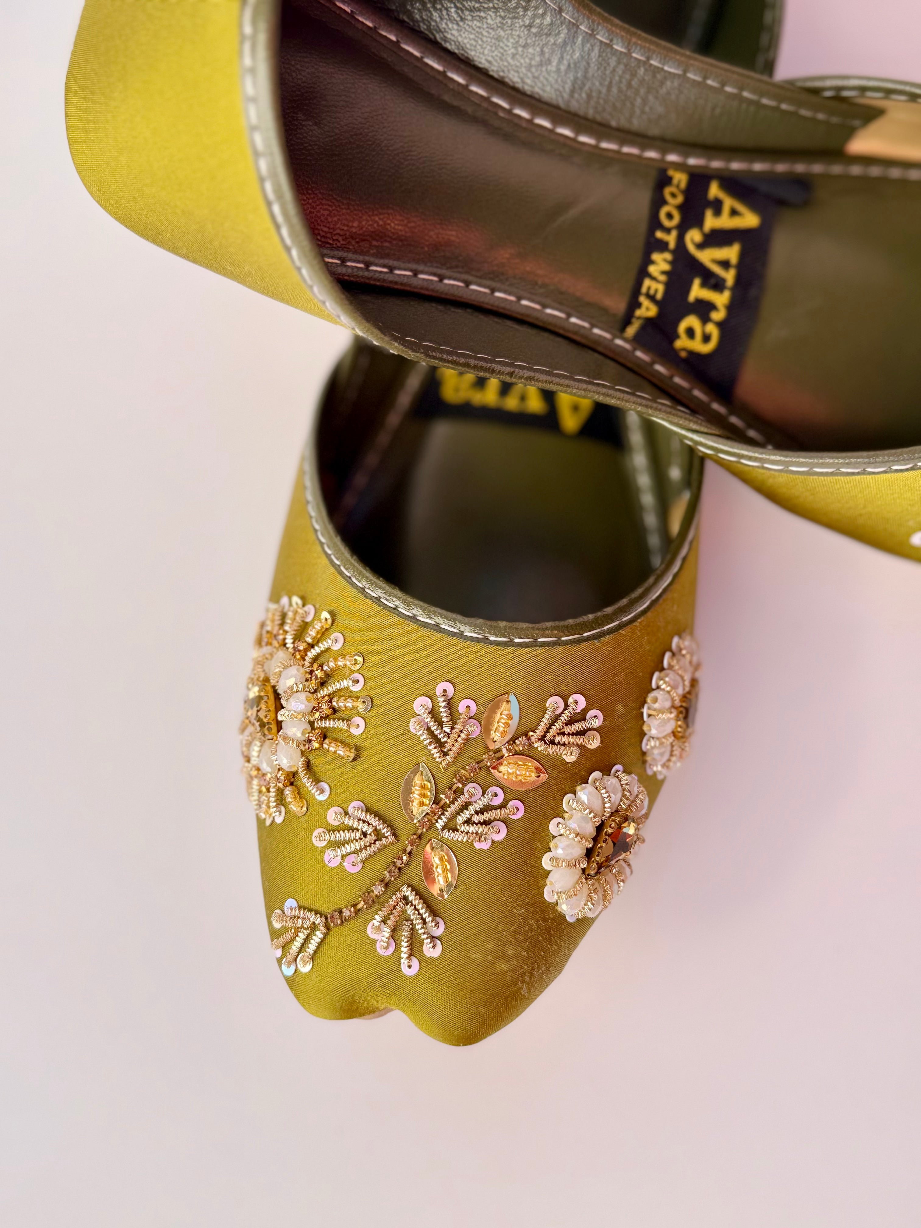 GULZAAR β Henna Leaves Khussa with Gold-White Floral Embroidery and Regal Beadwork